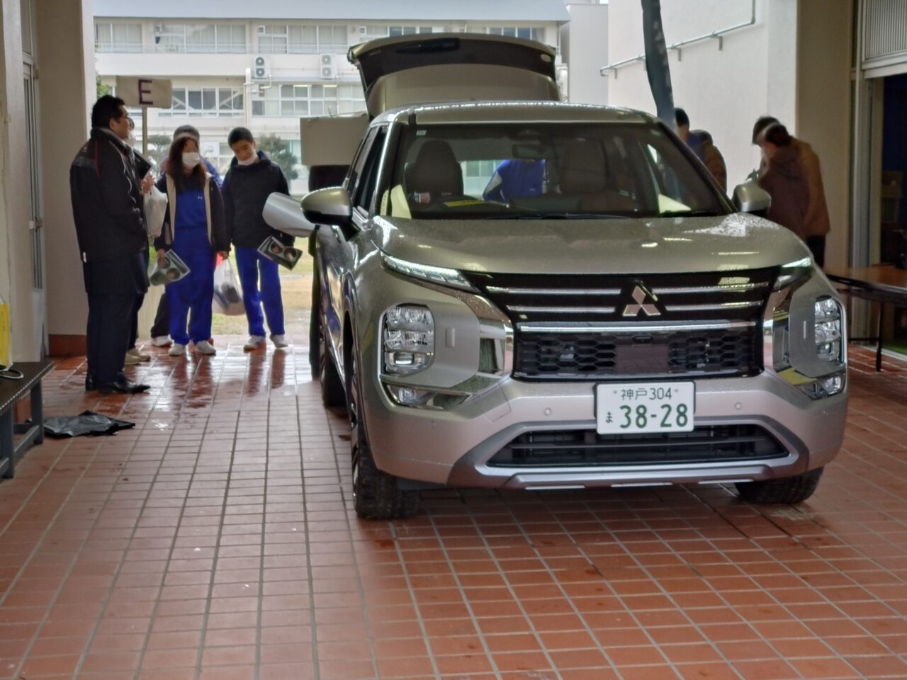 兵庫三菱自動車販売株式会社からは、外部給電可能な車両としてアウトランダーPHEVを展示し、バッテリーに蓄えた電気を家電製品へ供給する給電デモンストレーションを実施し、災害時の非常用電源として、車から家庭へ電力を供給できる実用性や、システムの有効性を体験していただきました。
