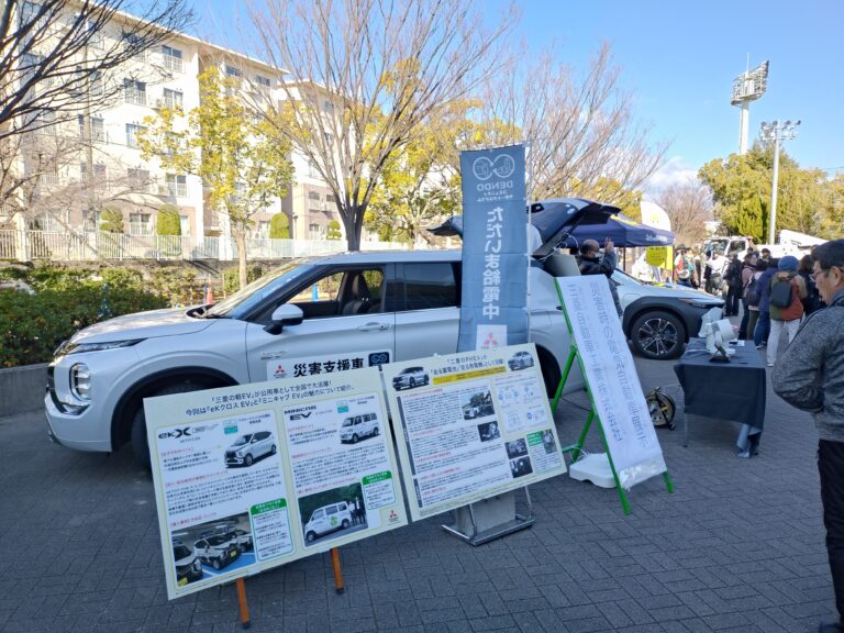 兵庫三菱自動車販売株式会社からは、外部給電可能な車両としてアウトランダーPHEVを展示し、バッテリーに蓄えた電気を家電製品へ供給する給電デモンストレーションを実施し、災害時の非常用電源として、車から家庭へ電力を供給できる実用性や、システムの有効性を小さなお子様から高齢者の方まで幅広い方たちに体験していただきました。