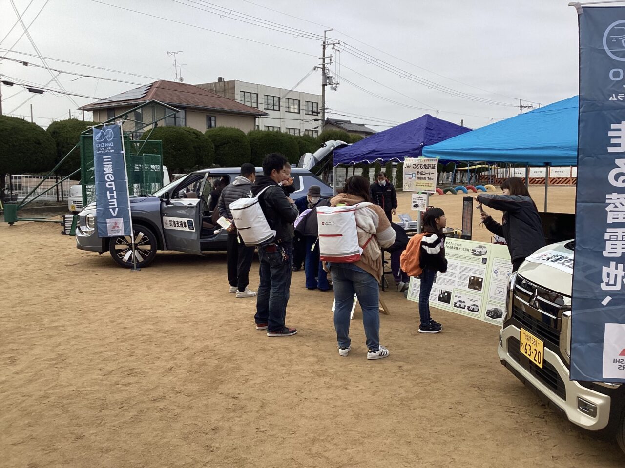 姫路三菱自動車販売株式会社からは、外部給電可能な車両としてアウトランダーPHEVとeKクロス EVを展示し、バッテリーに蓄えた電気を家電製品へ供給する給電デモンストレーションを実施し、災害時の非常用電源として、車から家庭へ電力を供給できる実用性や、システムの有効性を小さなお子様から高齢者の方まで幅広い方たちに体験していただきました。