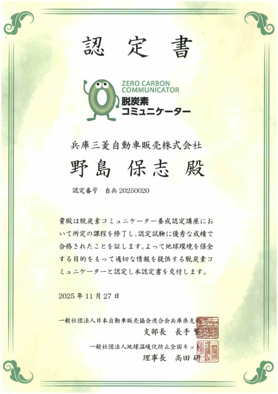 兵庫三菱自動車販売株式会社(神戸市西区 代表取締役社長 西原興一郎)では、環境負荷の少ない車の選択支援やカーボンニュートラルの推進に向けた取り組みの一環として、「脱炭素コミュニケーター認定制度」に参加し、社内から3名が認定を受けました。